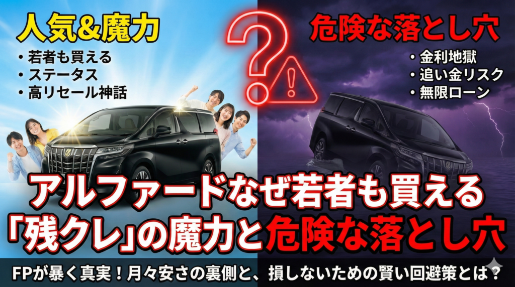 「月々数万円で、憧れのアルファードに乗れる!」 そんな甘い言葉に惹かれて、残価設定型ローン(残クレ)を検討している方は多いのではないでしょうか。 広々とした高級ミニバンで家族と旅行に行ったり、子供の送り迎えをしたりするのは、まさに夢のカー...