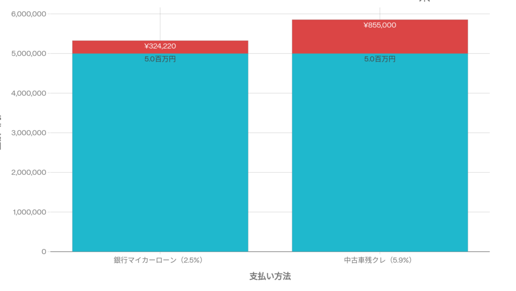 銀行のマイカーローン(金利2%前後)で500万円を借りて5年で返す場合と、残クレ(金利5.9%)で買う場合。支払総額の差だけでなく、「資産としての価値」にも大きな違いが出ます。
