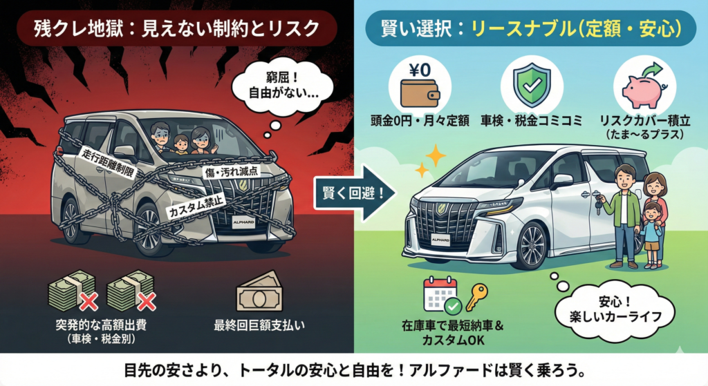 アルファードという車両自体は、素晴らしいファミリーカーであり、家族の安全と快適性を提供してくれる価値ある資産です。問題は「どう支払うか」という選択にあります。