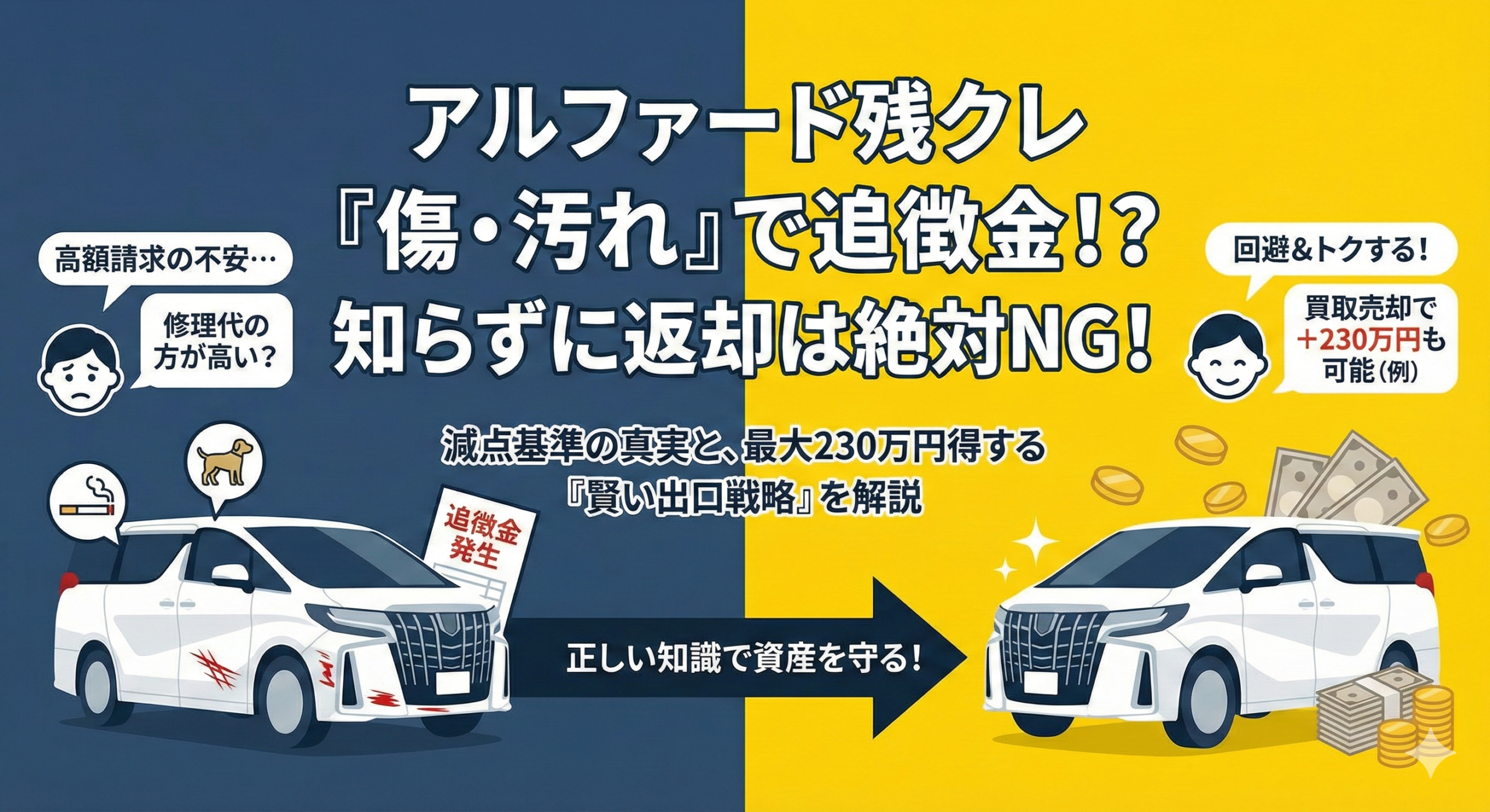 特に、高級ミニバンであるアルファードの場合、わずかな傷や車内の臭いが、一般的な大衆車とは比べ物にならないほどの「減点(=現金徴収)」につながるリスクがあります。