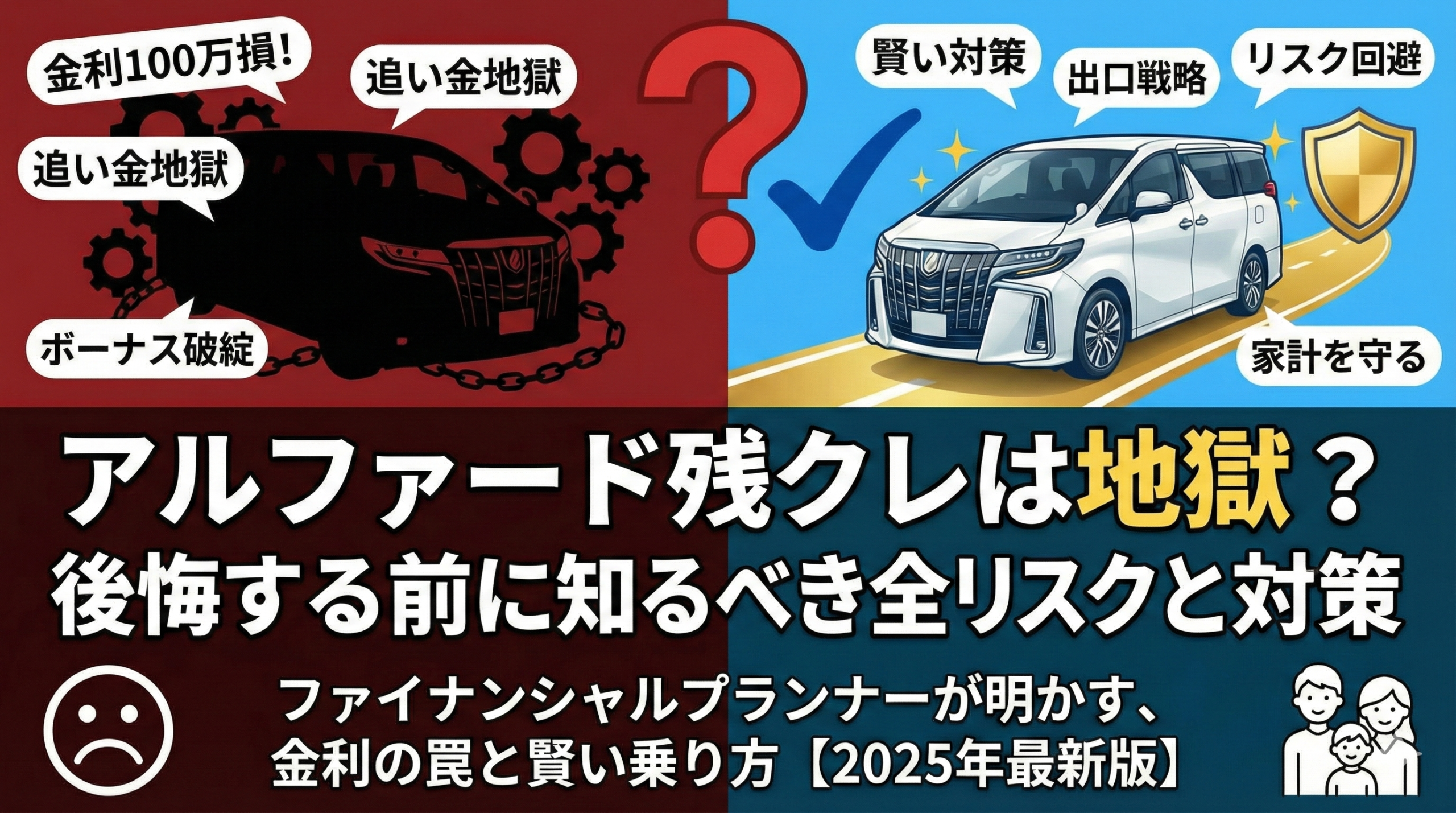 安心してください。私はファイナンシャルプランナーとして、多くの高級車オーナーのお金周りを見てきました。結論から言うと、残クレ自体は「悪」ではありませんが、「仕組みを理解せずに使うと地獄を見る」金融商品であることは間違いありません。特にアルファードのような高額車両の場合、そのリスクは数百万円単位に膨れ上がります。