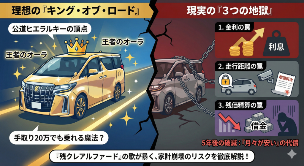 「月々が安い」と飛びついた残クレが、5年後には「100万円の借金」として襲いかかってくる。これが「残クレアルファード」の歌が警告する「破滅」の正体なのです。